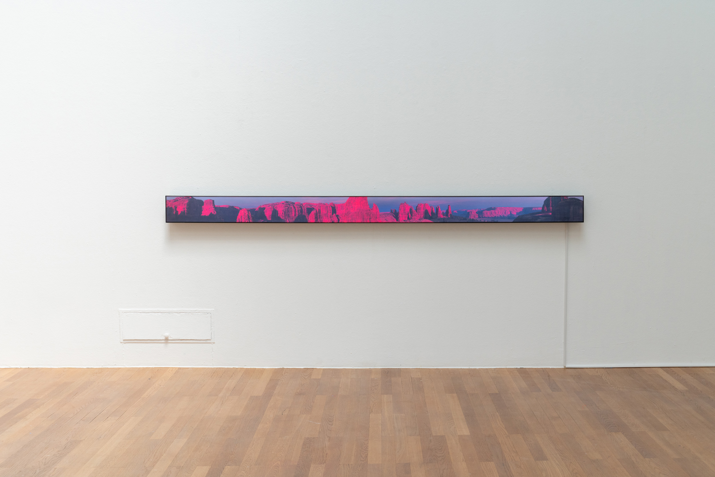 The mystical atmosphere that pervades the bright main hall extends into the darkened smaller halls of the galleries. Four photographic prints from the series Natural Origin (2023) depict what appear to be a particularly dense and lush forest, but in truth, the pictures are shots from virtual cameras in a 3D rendering modelled by the artist. Derived from the flora and fauna of Upstate New York, the rendering is both a visually pleasurable composition of digitized nature, and a simulation of an entire ecosystem. The complexity leading to the bucolic image motifs is further enhanced by the projection of moving leaf shadows over the four images.