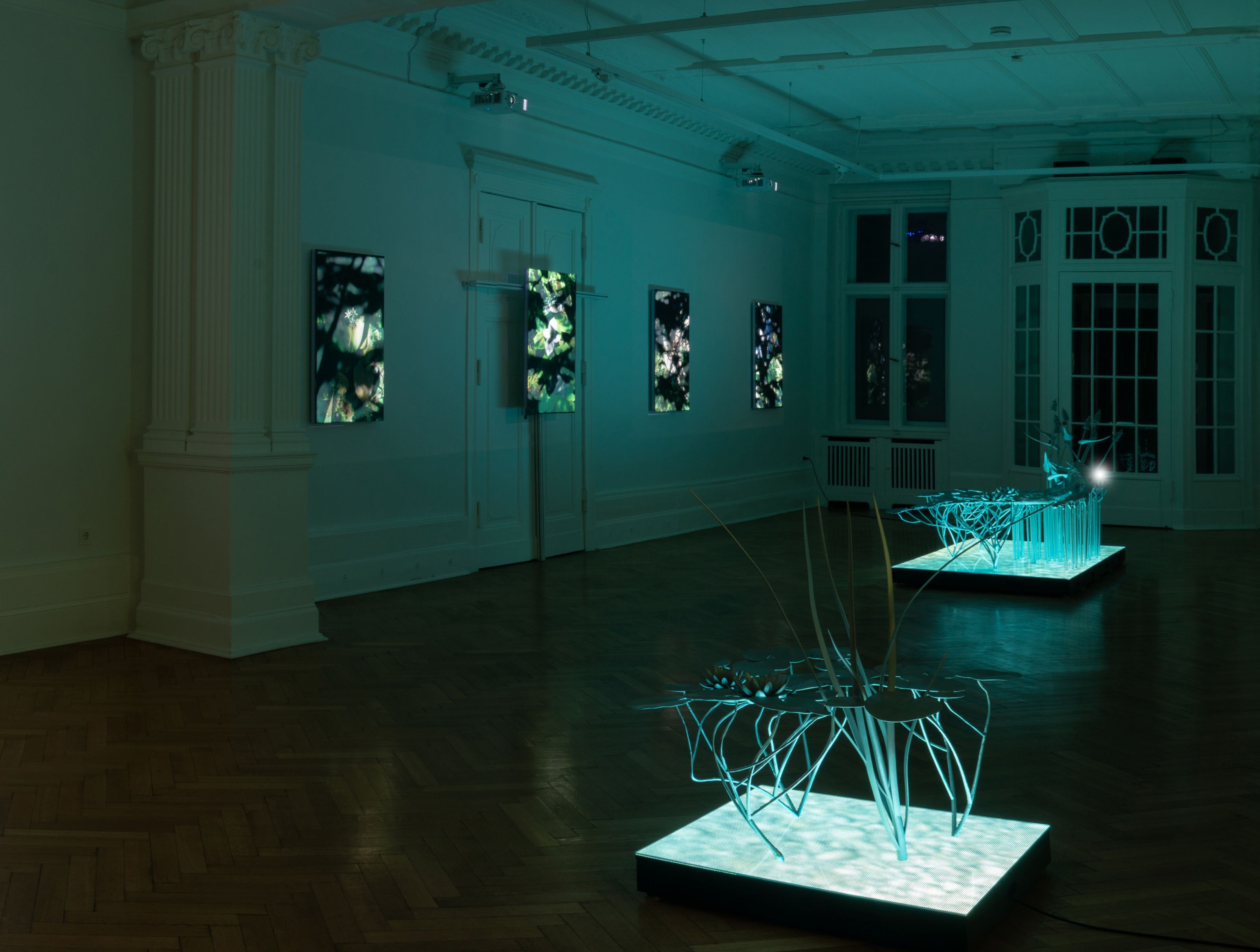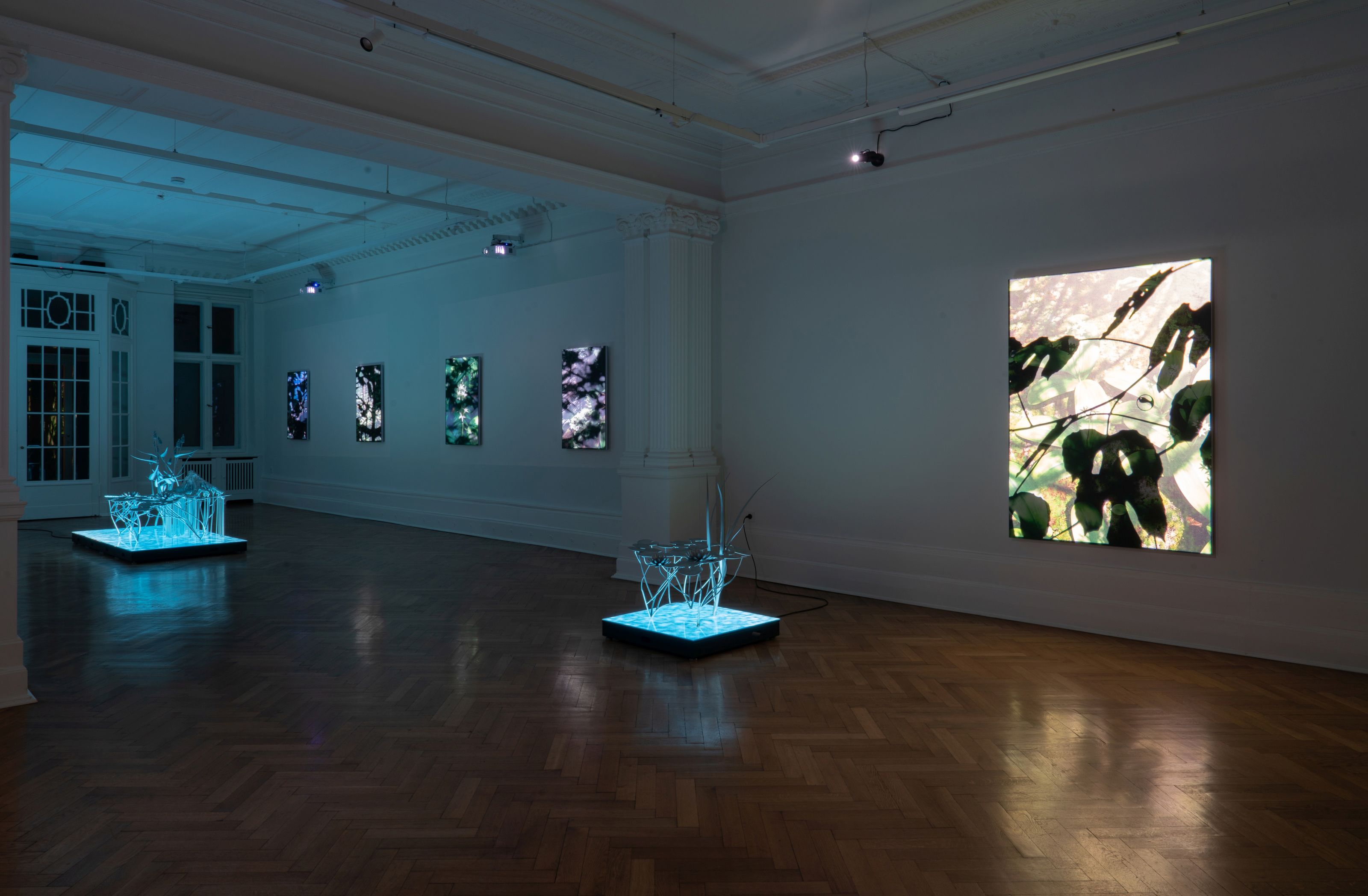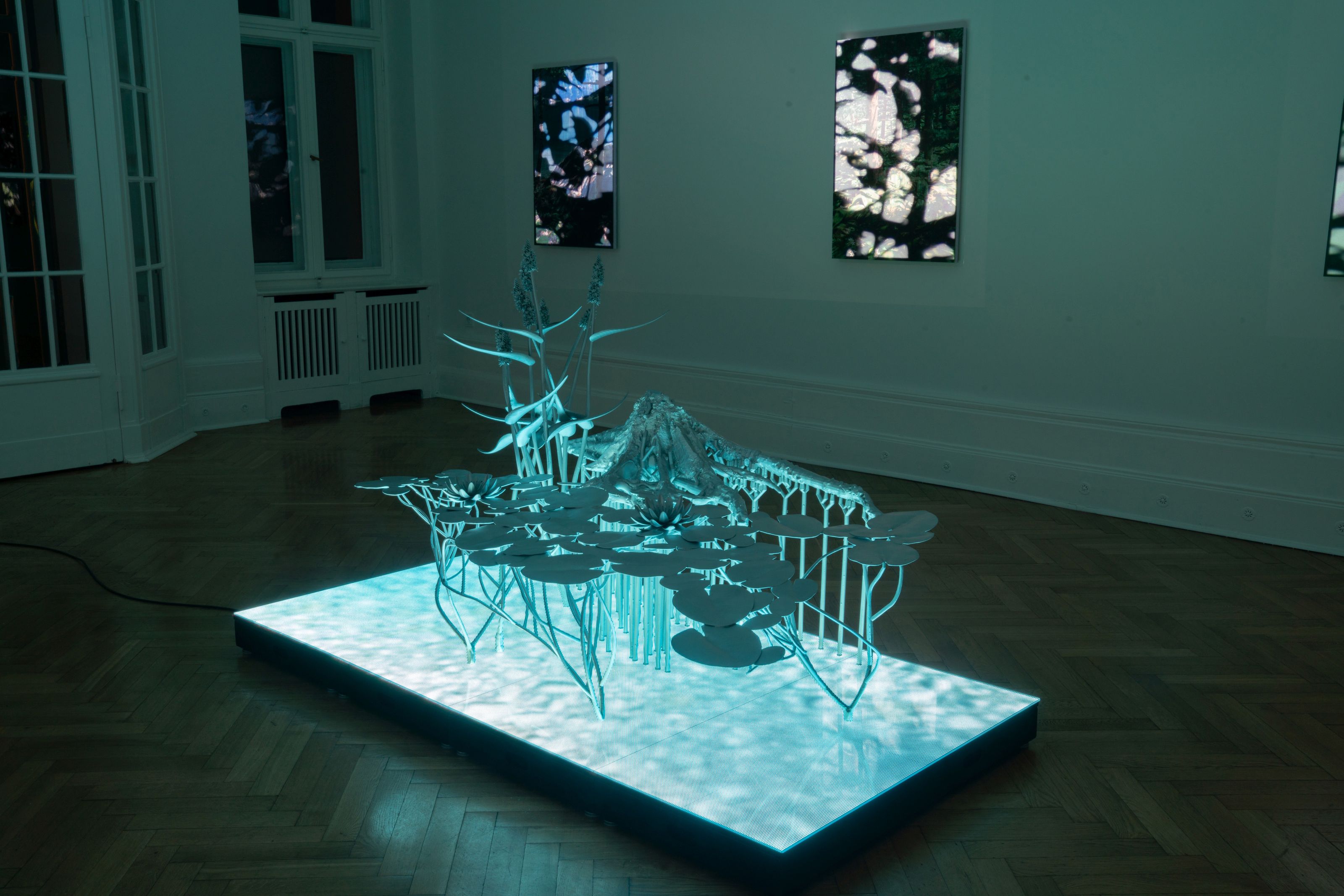Most of the works in Natural Origin are created from the simulation of the Temperate Deciduous Forest eco-region of Upstate New York and Vermont. While having supported our species for over 50 thousand years, Temperate Deciduous Forests evolved over the past 30 million years and are some of the oldest biocommunities living in the world. Their increasing vulnerability to the climate crisis make temperate forests symbolic of the challenges and metamorphoses undergone by the living world. The wall works derive from renderings of a digital ecosystem that Si-Qin has created, a virtual world that digitally recreates specific places in the Adirondacks and the Lake Champlain region and their specific species of plants and rocks. For the artist, the interest lies not in notions of the uncanny, artificial life, or the digitization of nature, but rather understands it as a devotional and meditative endeavor, a method by which one is compelled to see into the richness of nature at ever greater depths. “Life on this planet stands at the cusp of a great threshold,” Si-Qin writes in his manifesto A New Protocol, “As we awaken for the first time to the full scale of the territory of space and time—something any living thing has only known for a century—we awaken also to our own capacities for altering our planet and ourselves.” Si-Qin’s exhibition at Société seeks to articulate alternative conceptual and visual frameworks to foster a reengineering of our relationship with the planet, enabling us, as Kohn writes, to “snap back into the world of life.”